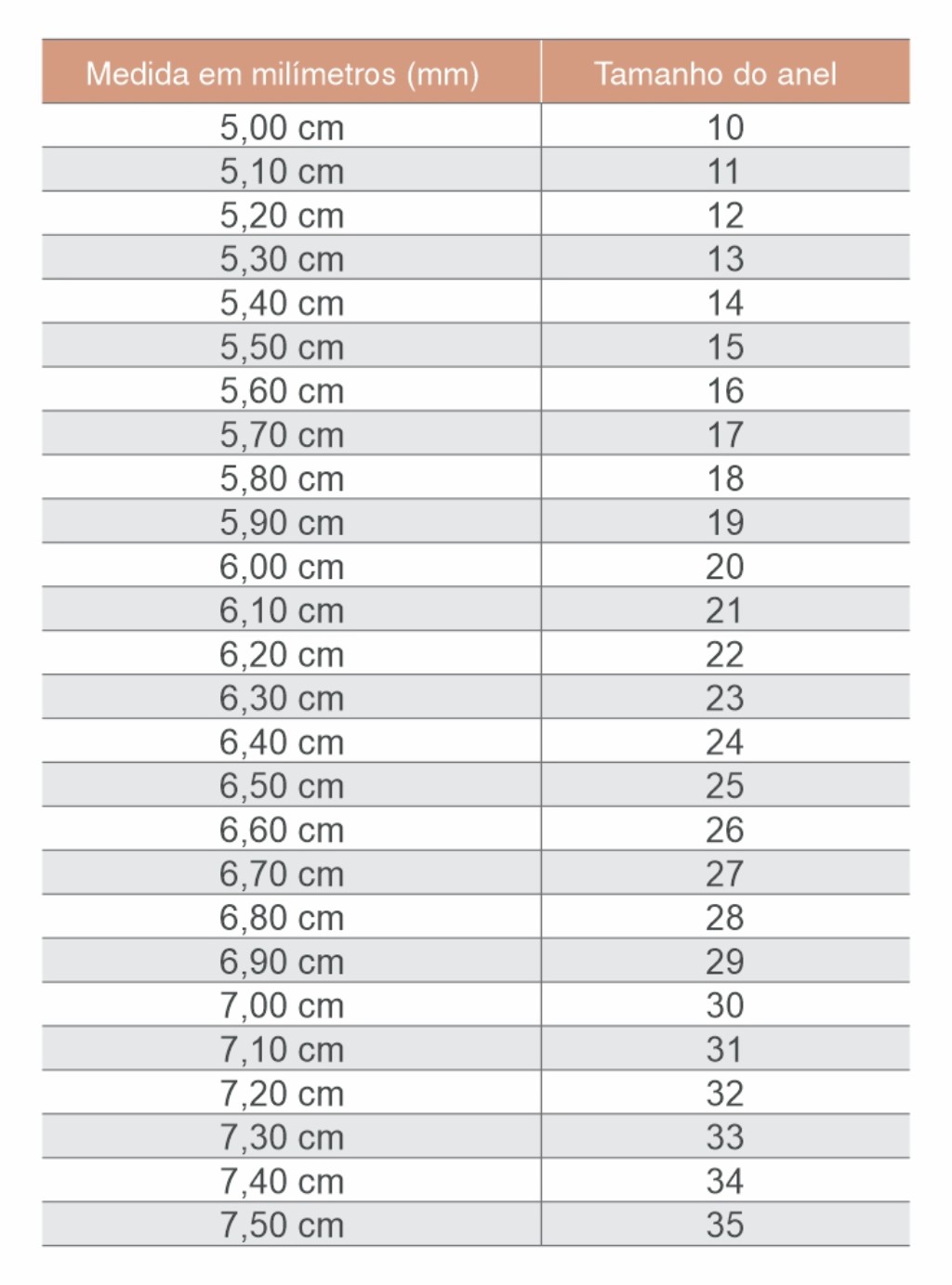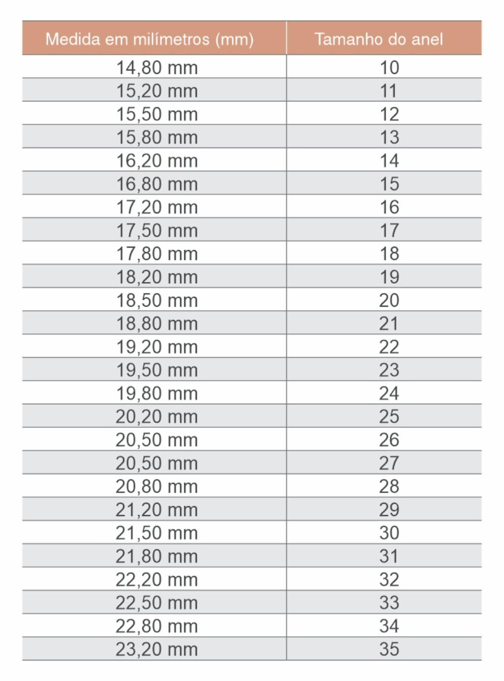 Tabela de numeração de anel em milímetros
