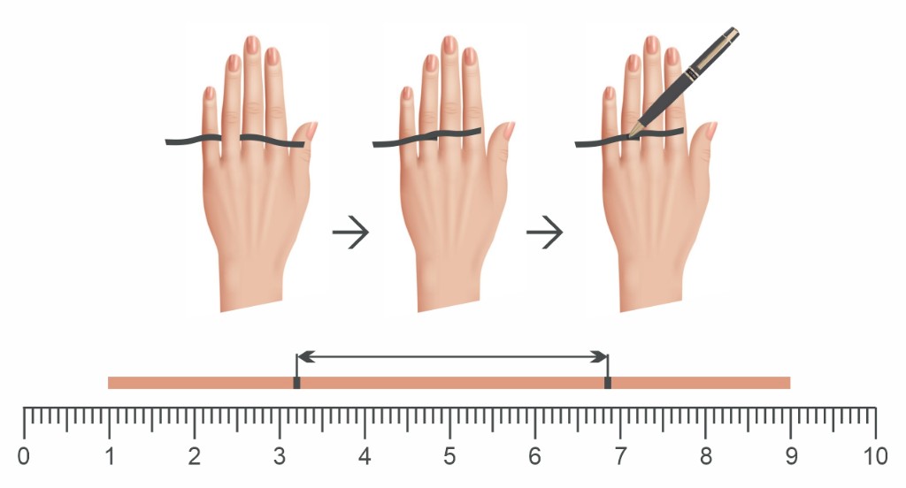 Para medir tamanho do seu dedo, com o auxilio de uma régua, meça a parte interna de um anel que seja do seu tamanho.